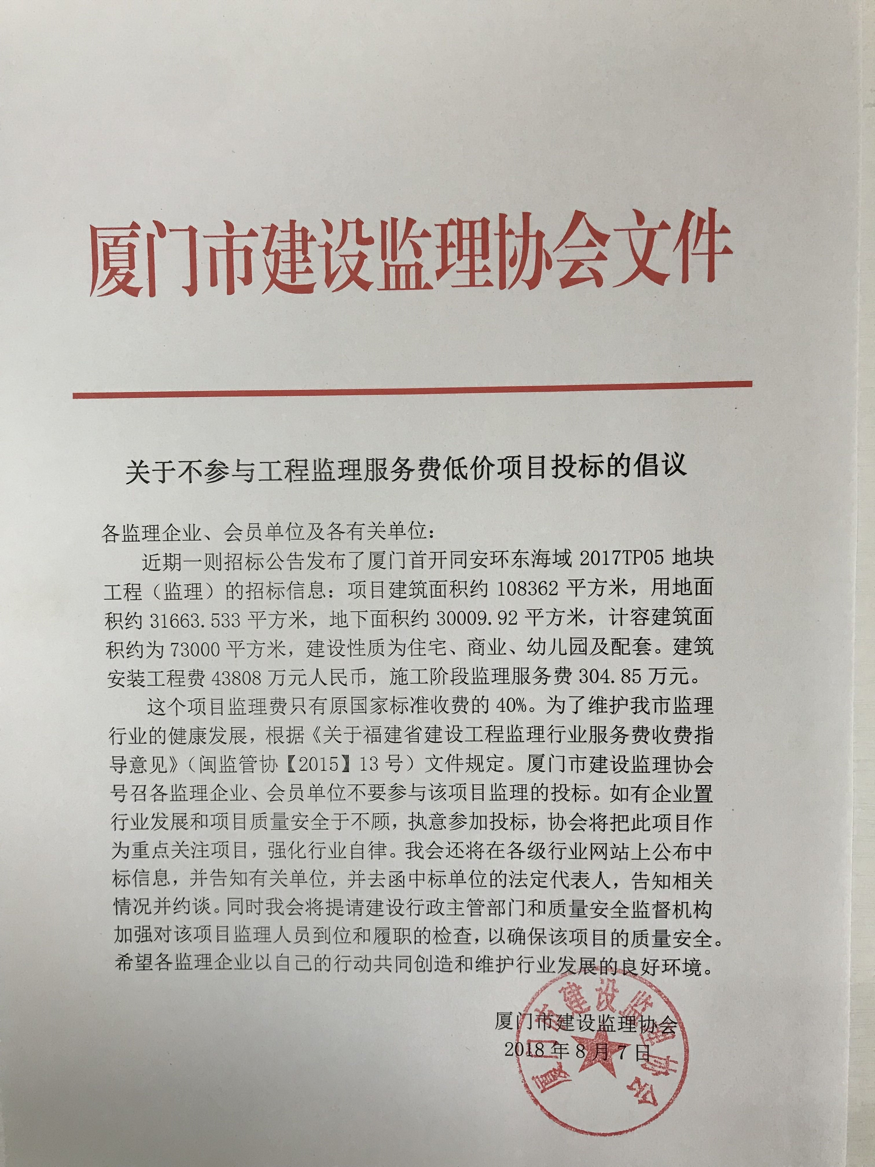 转发厦门市建设监理协会“关于不参与工程监理服务费低价项目投标的倡议”