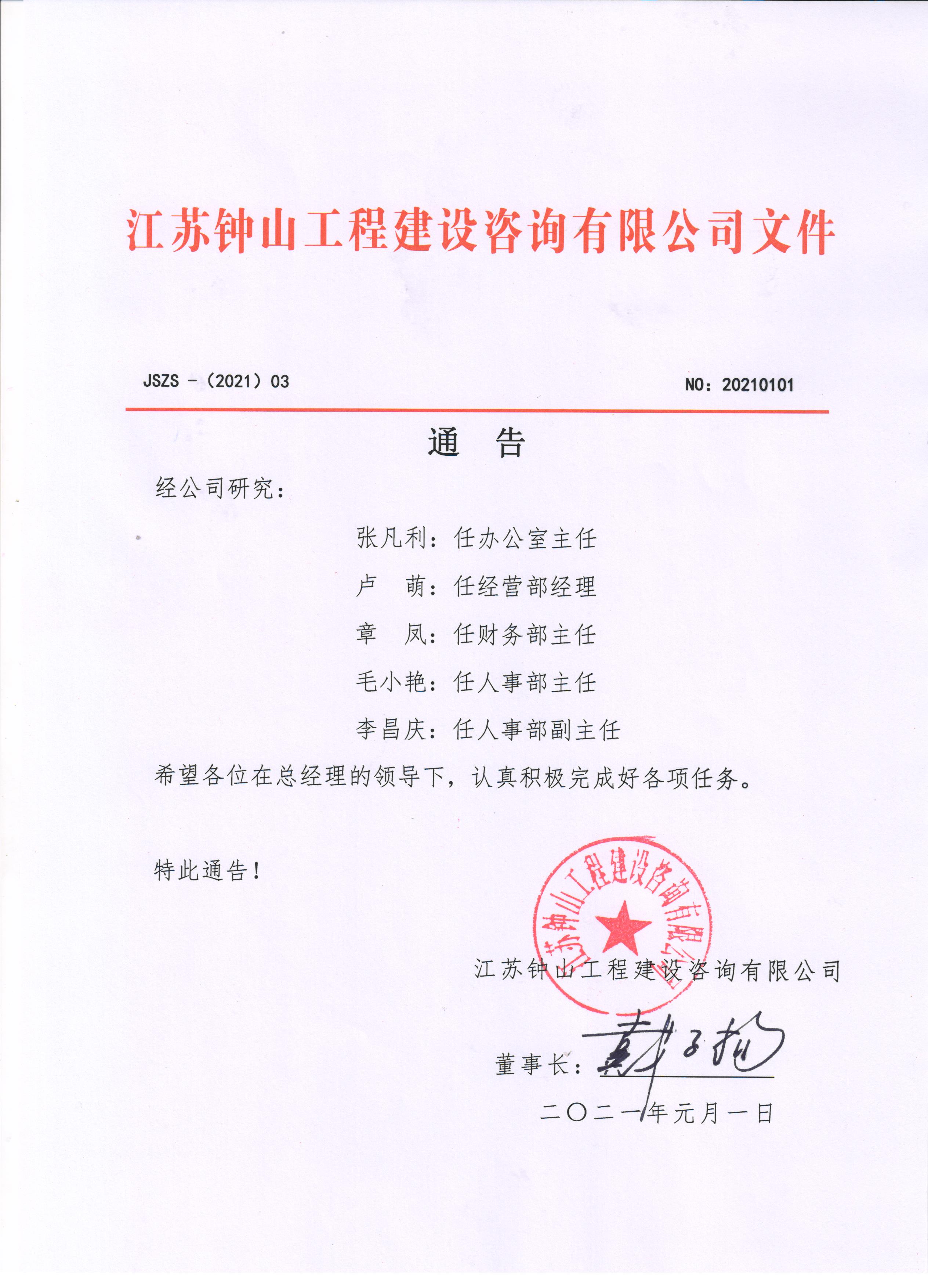 一直以来,感谢社会各界对的支持和监督。2021年,因公司的发展计划及管理需要,经研究决定,公司将对管理岗位进行相应的人员调整。今后,公司全体员工也将一如既往地为提供专业、优质、规范的服务而努力。