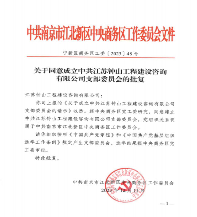 为加强企业基层党组织建设,发挥党组织战斗堡垒和共产党员的先锋模范作用,经过公司的筹备、申请,2023年12月11日,中共南京市江北新区中央商务区委员会同意批复支部委员会成立。